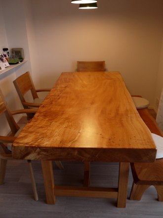 工夫の一枚! 欅のテレビボード 欅の無垢一枚板を納品しました。量販店で購入されたテレビ台に乗せるためのボードです。 ▼こんなふうに! ![]() 白いテレビ台に板のボード、とても素敵な組み合わせです。最初からこのようにデザインされたかのようなテレビボードになりました。お部屋の雰囲気にもぴったり。 ![]() ▼後ろにコードを通すくぼみを作ってあります。 ![]() お客様は以前、栃の机、杉コブのベンチ、タモの椅子のセットをお買い上げいただいたご一家。 納品したテーブルセットは「とくにベンチの座り心地がとてもいい」と奥さまに褒めていただきました。 ![]() 配達時はいらっしゃらなかったお嬢さんから「木のおじちゃんへ」、折り紙のチューリップが用意されていました。社長がとても喜んでいました。ありがとう(^^)/ ![]() ▼今年2月、テーブルを納品したときの写真です。 ![]() |